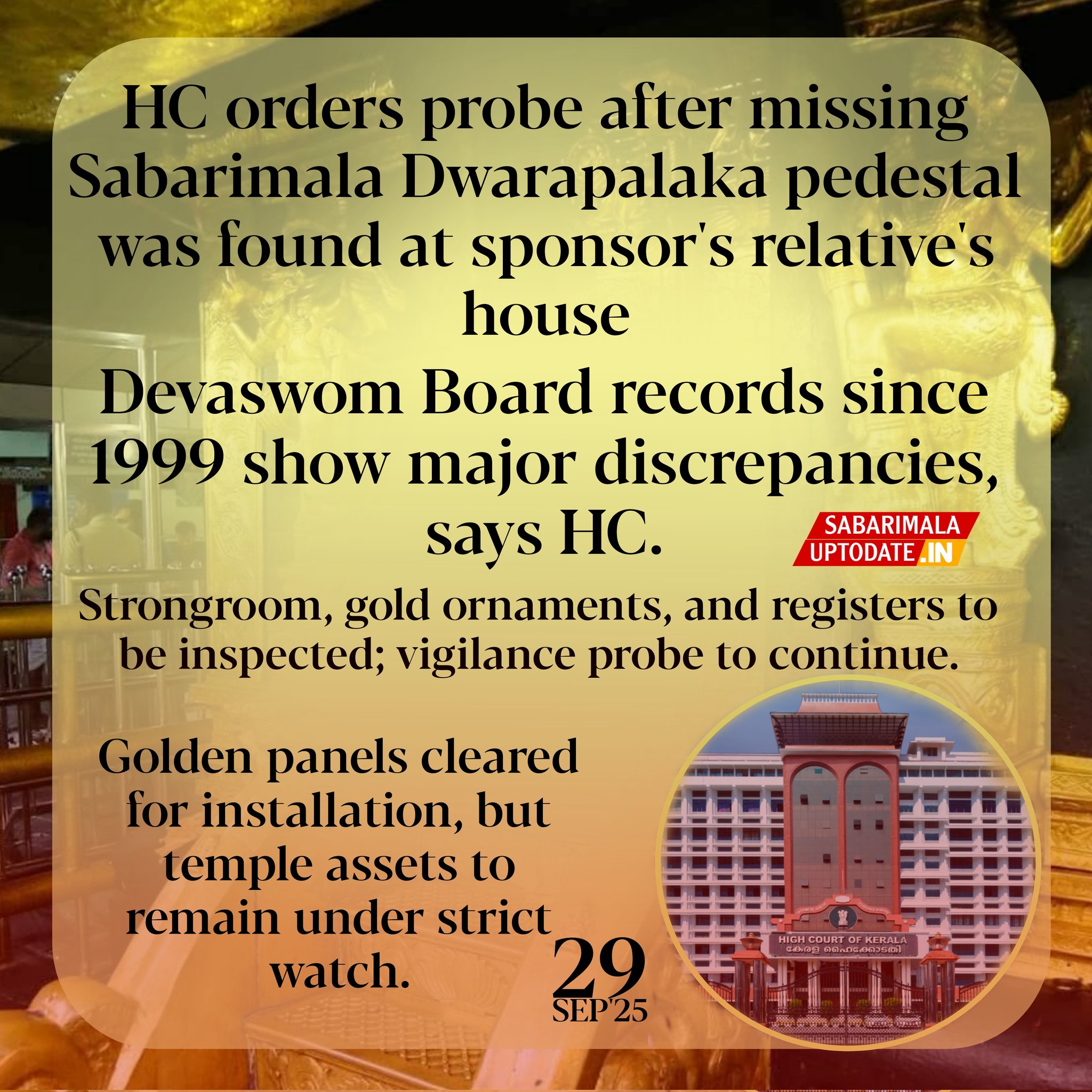 As part of the investigation, when asked about the Dwarapalaka pedestal, sponsor Unnikrishnan said that he had donated it and did not know where it was. It was while considering the case related to the golden panels that the High Court also referred to the matter of the pedestal. Following this, the Devaswom Vigilance investigation was launched,the matter has been posted for hearing in October end.