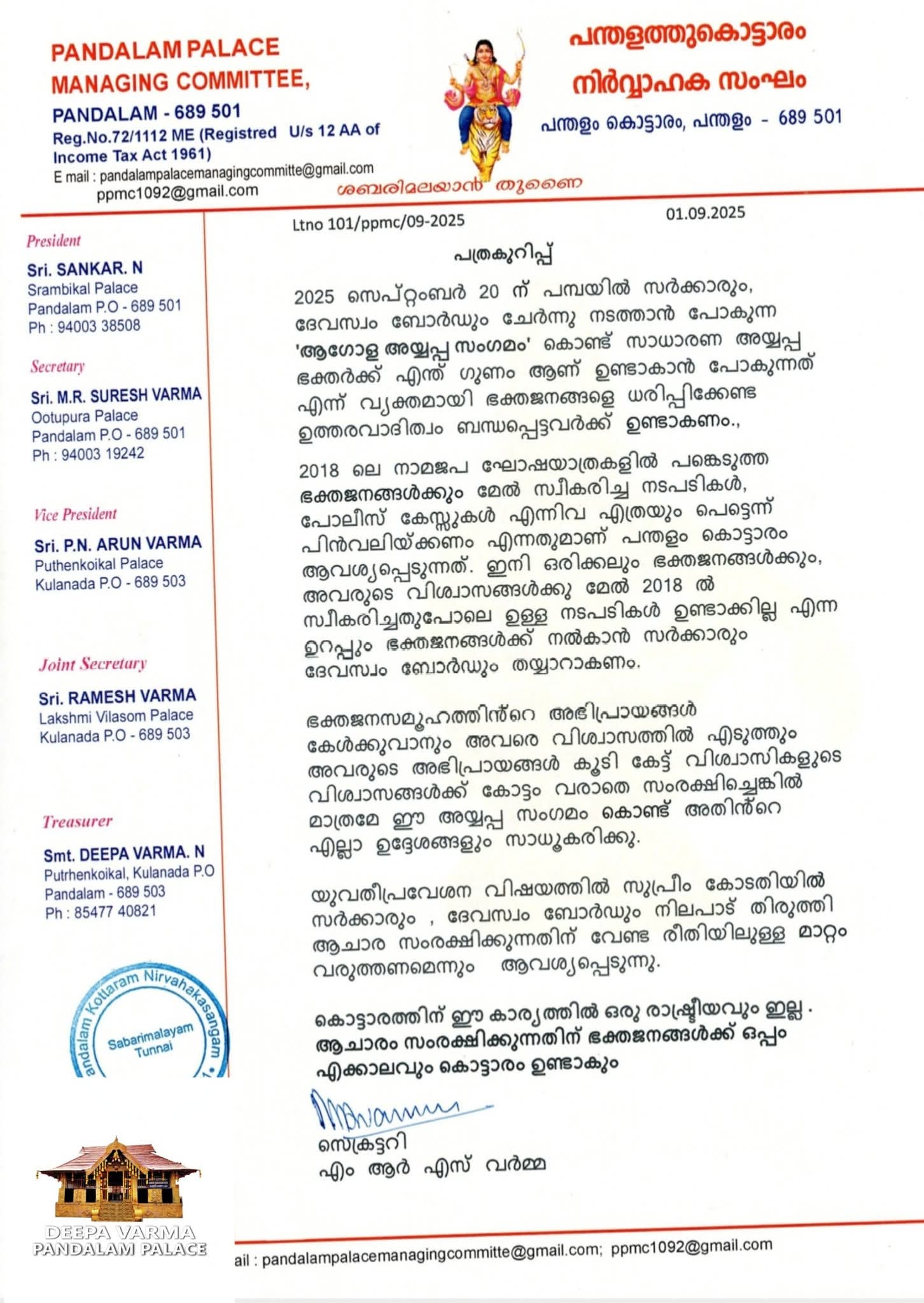 Reaffirming its solidarity with the devotees, the palace committee questioned the benefits of the upcoming Global Ayyappa Sangamam for ordinary pilgrims and stressed that devotees deserve clarity on how such events will serve them.