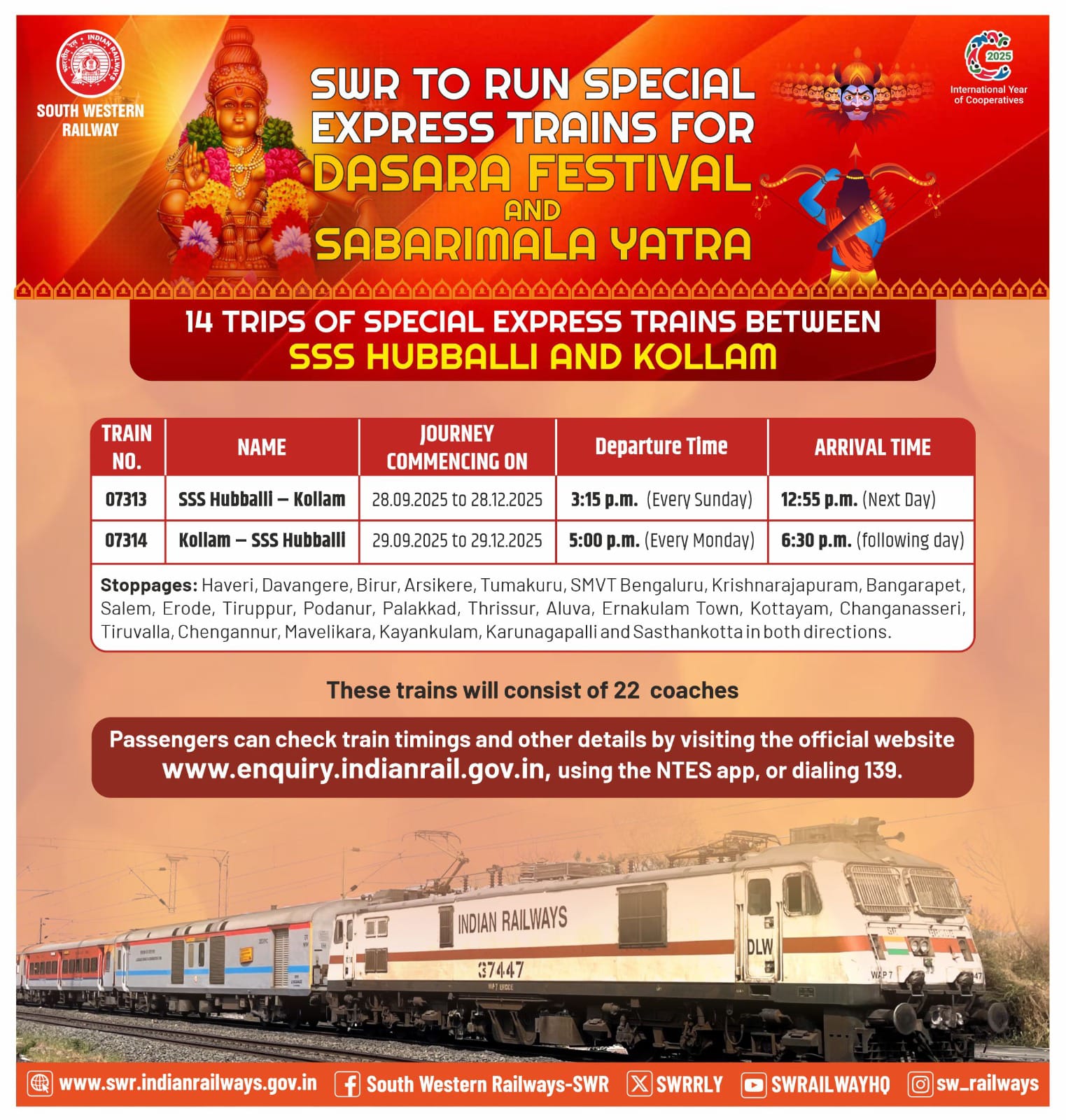 The Hubballi–Kollam Special Express will operate every Sunday from September 28 to December 28, departing Hubballi at 3:15 p.m. and reaching Kollam at 12:55 p.m. the following day. In the return direction, the Kollam–Hubballi Special will run every Monday from September 29 to December 29, leaving Kollam at 5 p.m. and arriving in Hubballi at 6:30 p.m. the next day.