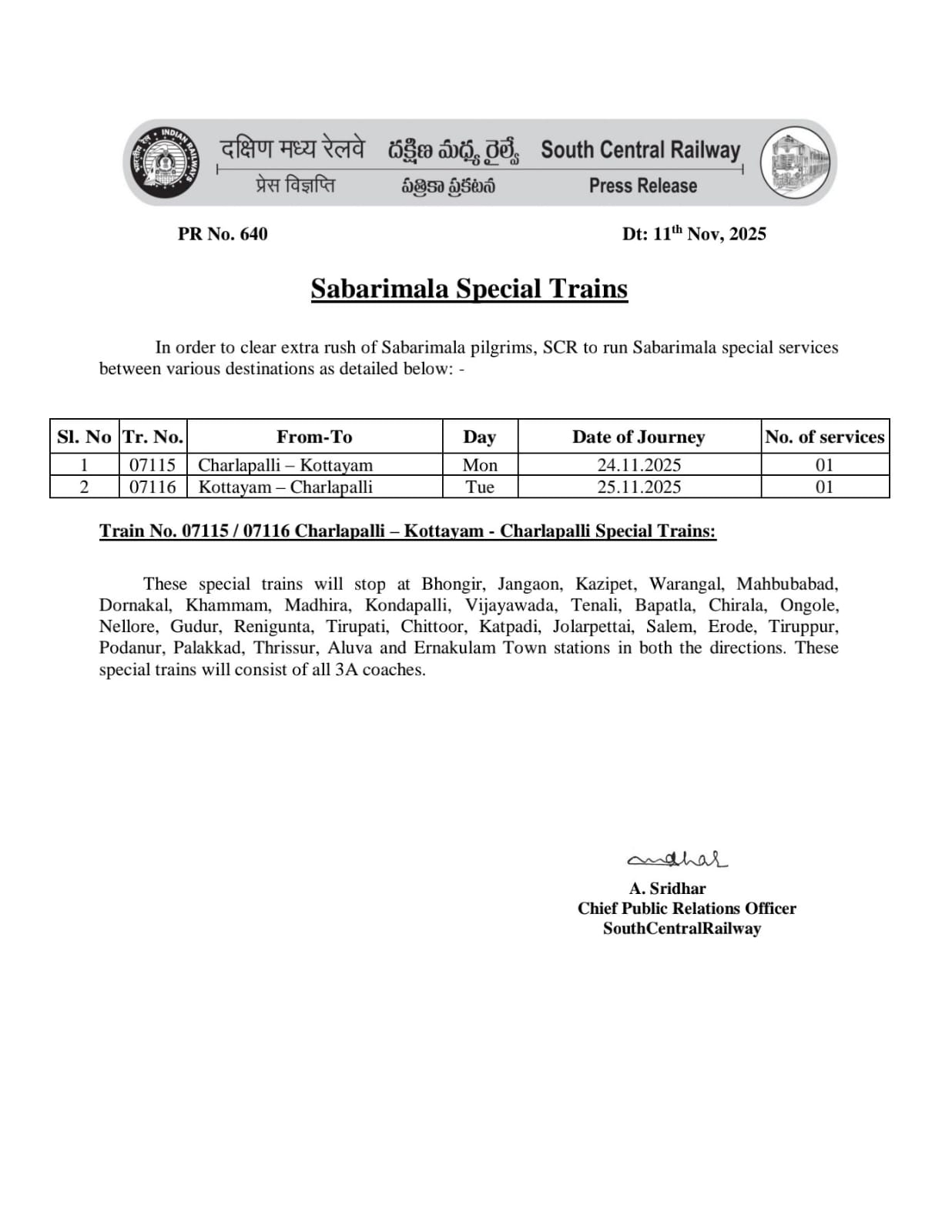 07116 Kottayam–Charlapalli: Nov 25, 2025
