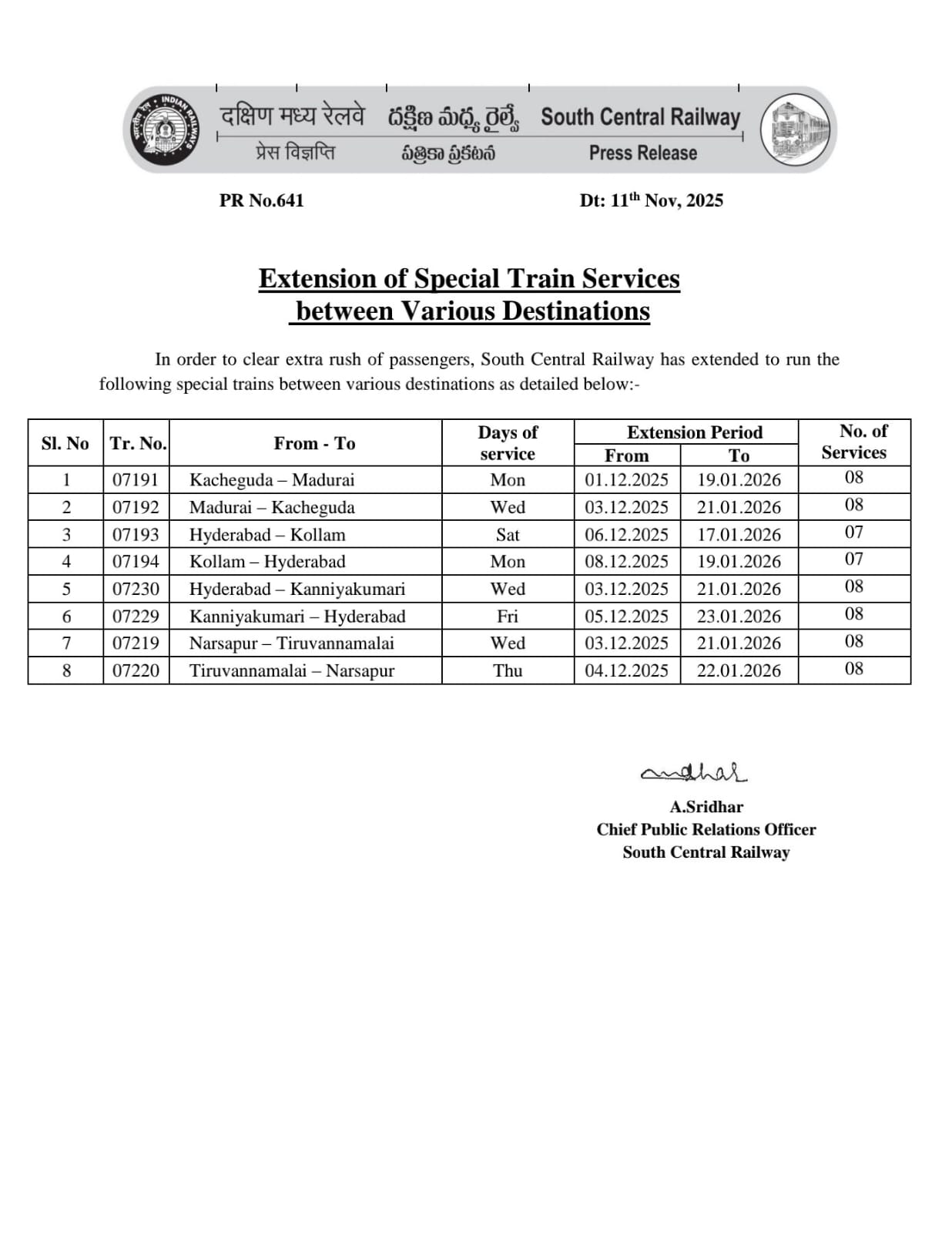 Hyderabad, Nov 11, 2025: South Central Railway has announced special trains to manage the Sabarimala pilgrimage rush and festive season crowd.