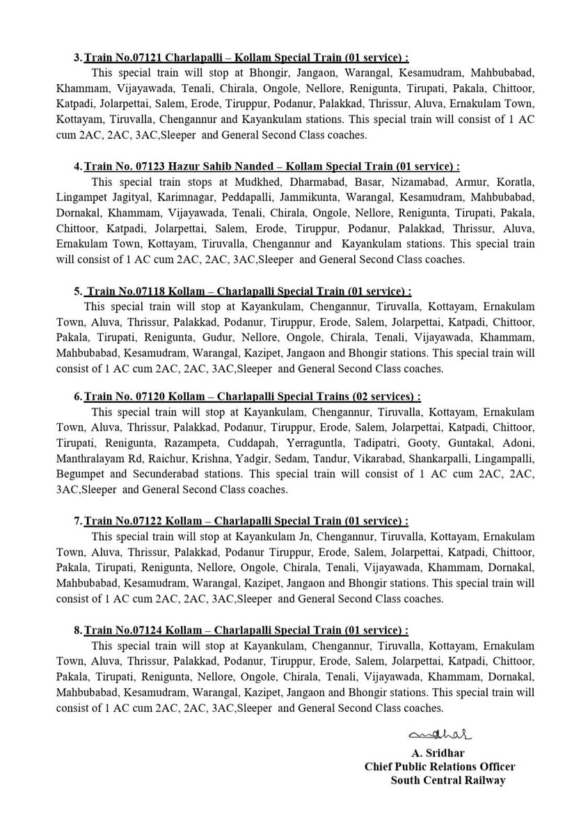 Additionally, SCR will operate two Charlapalli–Kollam special services (Train Nos. 07119 and 07121) on December 17, 20, and 31. These trains will run through Secunderabad, Begumpet, Lingampalli, Shankarpalli, Vikarabad, and Tandur, and then continue via Guntakal, Chittoor, and Katpadi before reaching Kollam.