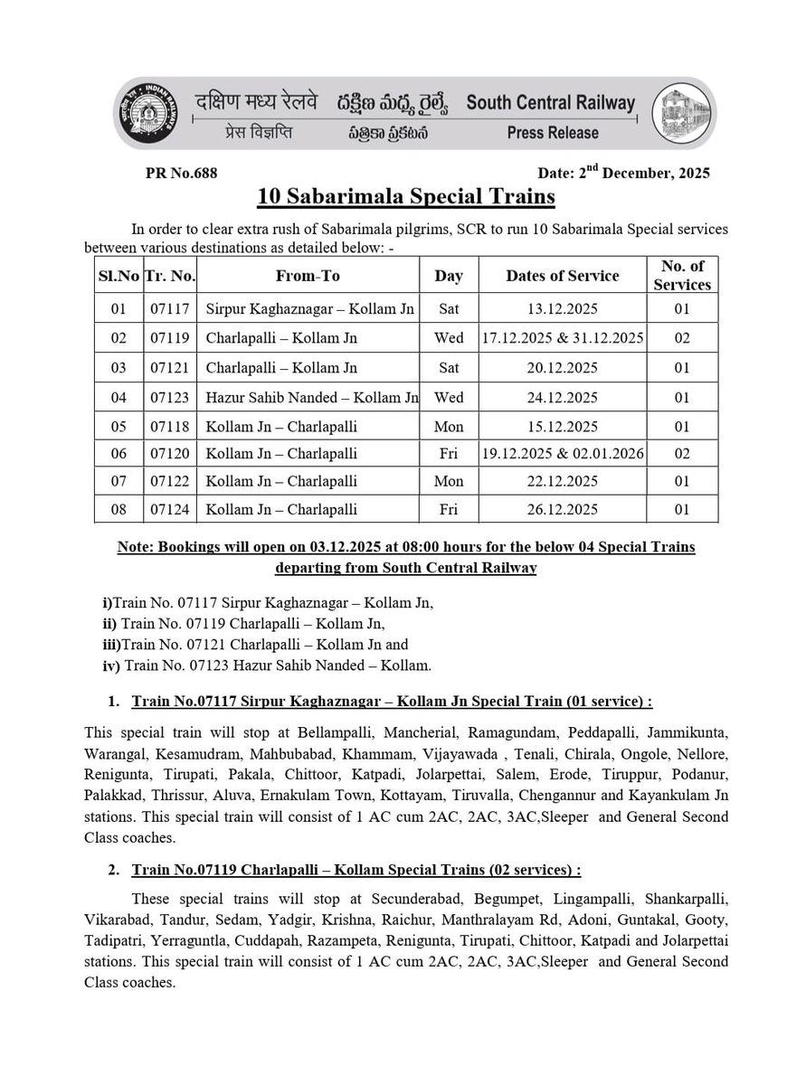 Hyderabad: To accommodate the heavy influx of devotees travelling to Sabarimala, the South Central Railway (SCR) has announced special train services between December 13 and January 2. These services will connect various stations within the SCR zone to Kollam Junction in Kerala, providing smoother travel options during the peak pilgrimage season.