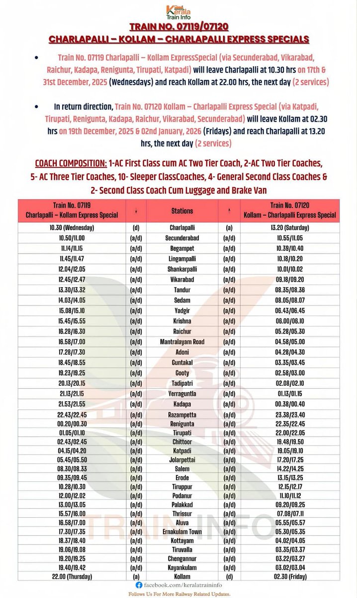 Train No. 07119 – Charlapalli → Kollam (via Secunderabad, Raichur, Kadapa, Renigunta, Tirupati, Katpadi)