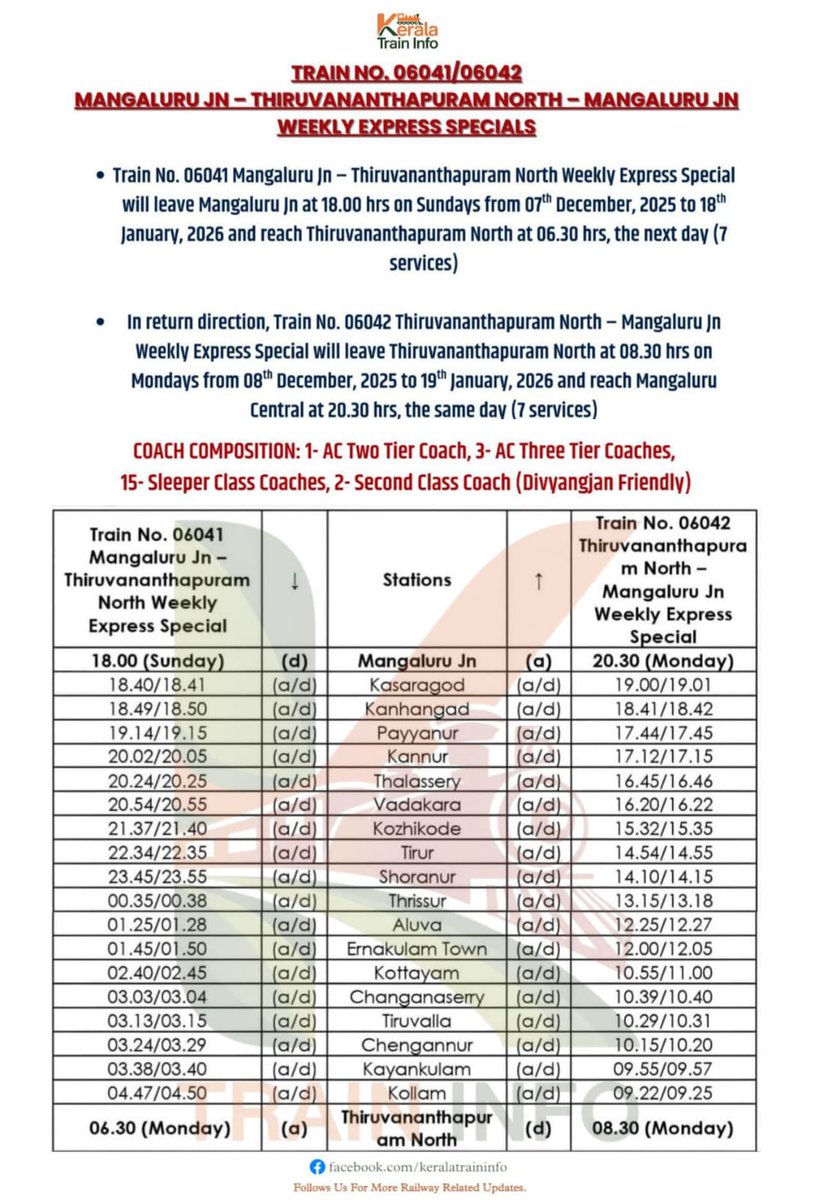 2. Mangaluru Jn – Thiruvananthapuram North Weekly Express Specials (06041/06042)